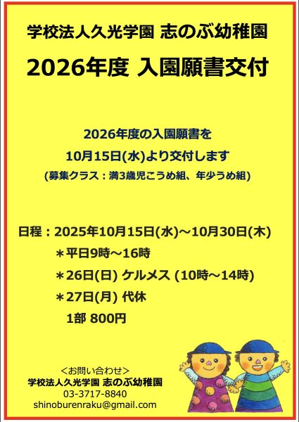 <入園希望者>2026年度入園願書の交付を10/15(水)〜開始します!